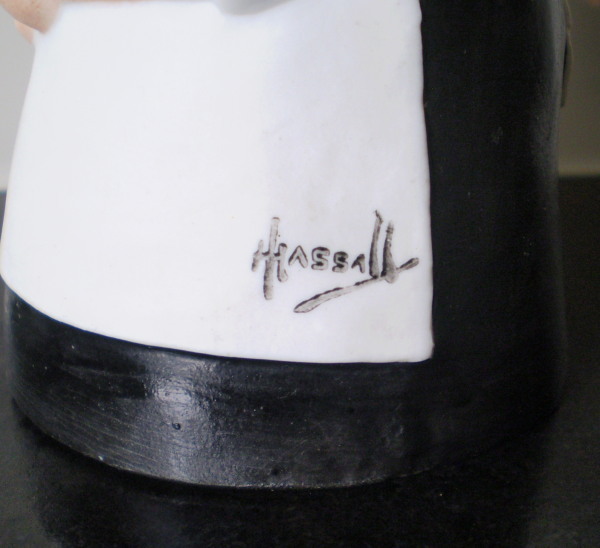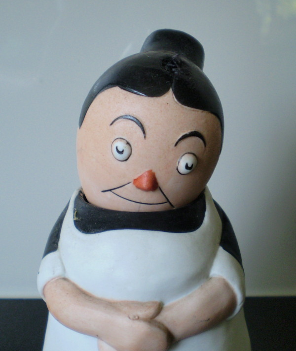 Carlton Ware figurine 'Mrs Bun' designed by John Hassall in 1912, moveable head which when changed seems to give her a different expression with each angle. This piece is not perfect - there is a crack on the head as shown. 5 1/4" high, signed Hassall and has the registration number 61194 on the base. Very cute!