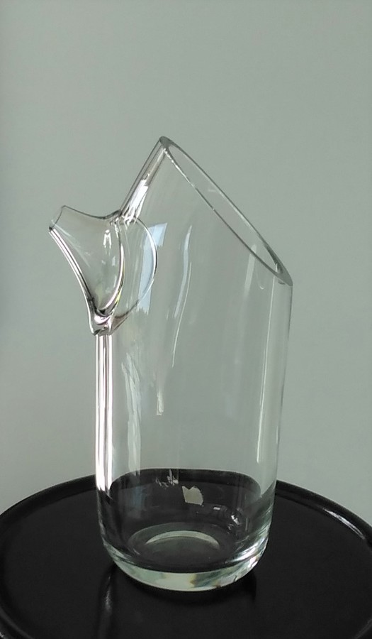 This decanter represents the style of the time really well with the asymmetrical rim and sleek design. It still has most of the original Kosta sticker, and is incised on the base Kosta L// 1567. It measures 8 1/4 " high and is in excellent condition with no chips or cracks.